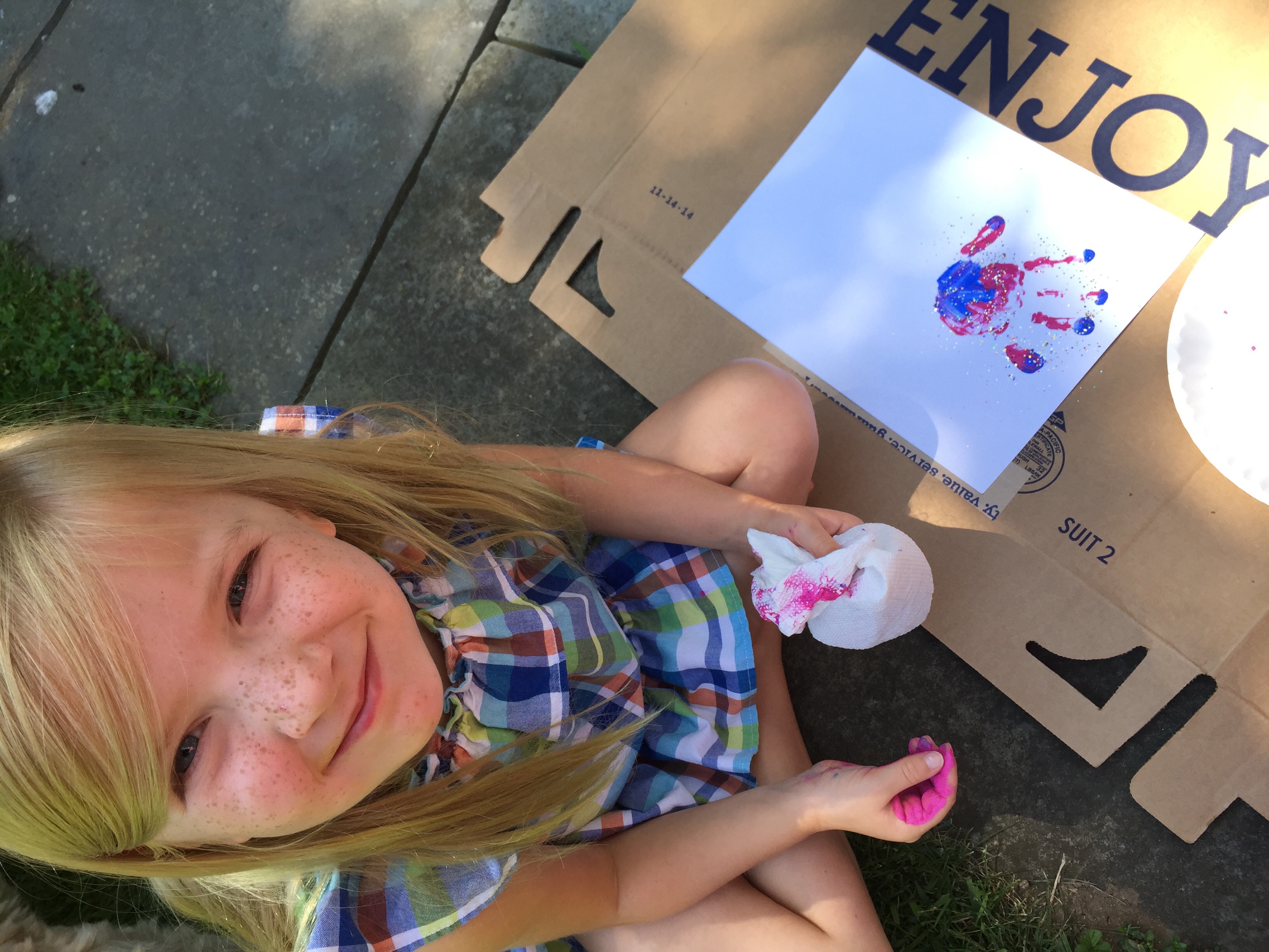First, paint your hand. Get creative!  We made stripes, hearts, polka dots and swirls using the paint and brushes. Little Wills even stamped his hand on the plate of paint without making a specific pattern. His butterfly turned out to be very abstract!