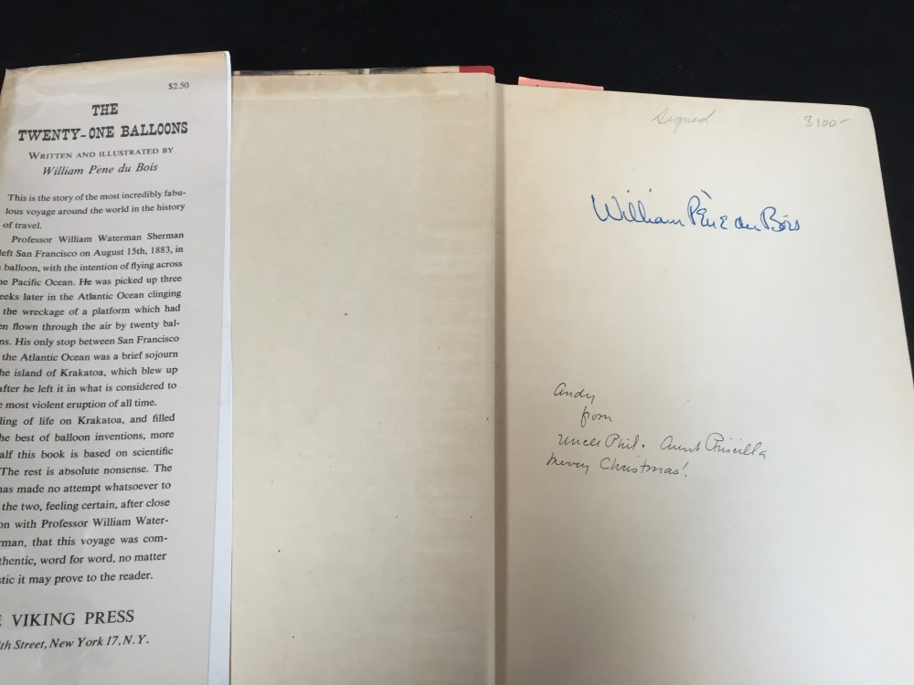 The second edition of The Twenty-one Balloons looked almost like the modern hardcover edition available today. Yet, with a closer look at the faded pages, we discovered that it was signed by the author!