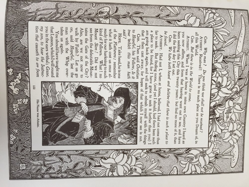 The ancient, fabric-clad edition of The Pilgrim’s Progress from 1898 was bedecked with stunning illustrations. I was reminded of the tedious work of medieval monks as I flipped through the visually astounding pages.