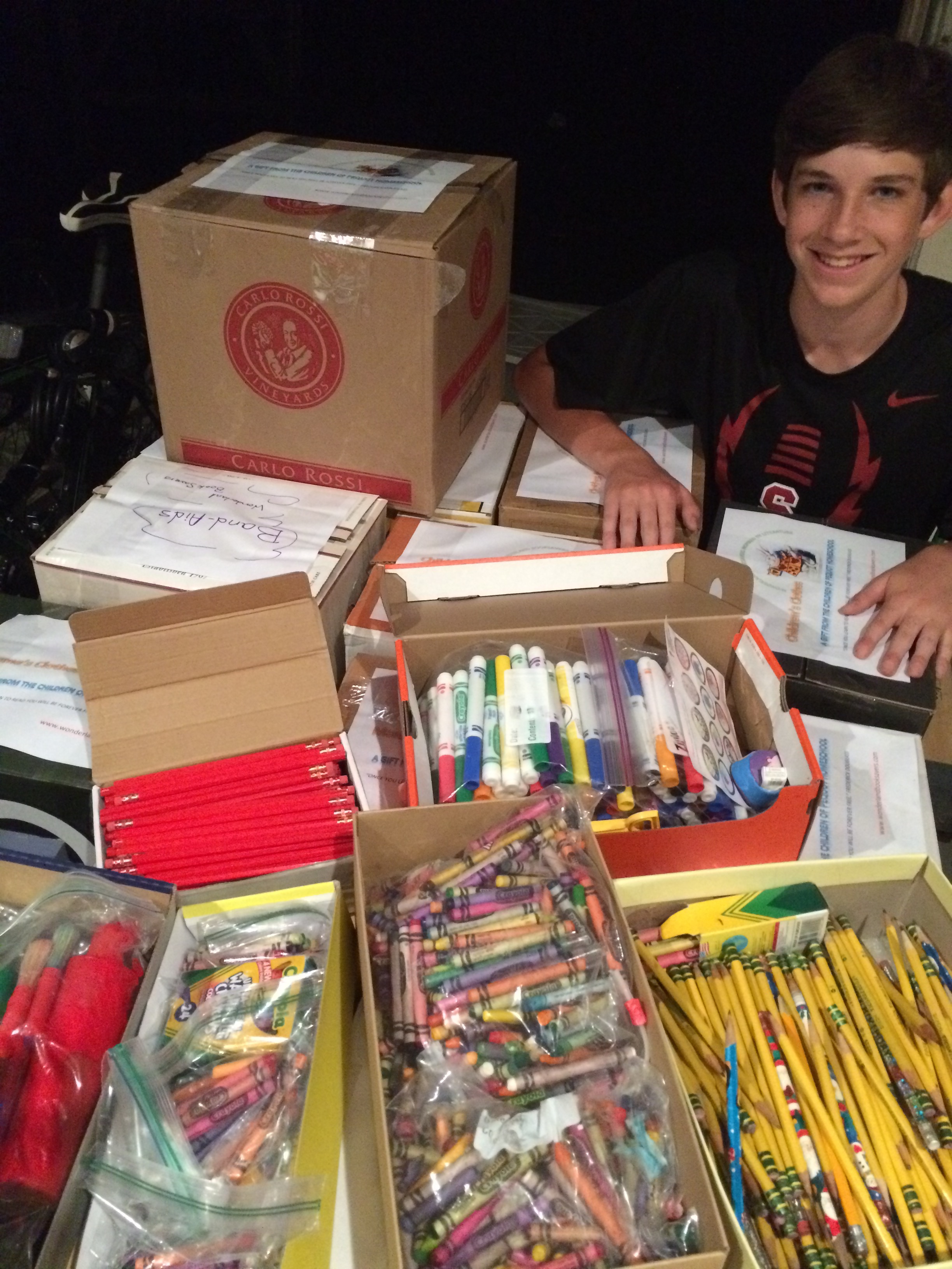 cases of school supplies gathered by Reid and packed by Pierce!