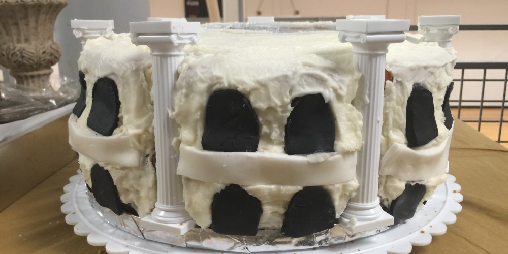 Our parents had decorated it to resemble Roman palace. We were served chicken legs, ham, Caesar salad, bread, and various desserts including a Roman Coliseum cake.