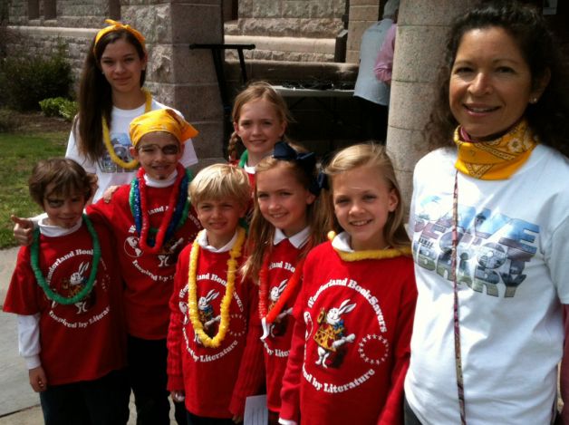 Wonderland Booksavers, with team managers Annabel and Alison Barry, speak at a rally to restore funding to Pequot Library